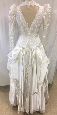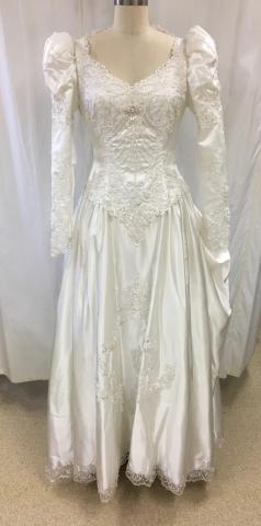 White wedding dress with beaded and lace bodice. Puff sleeves. Picture shows bustled skirt but can have a train.