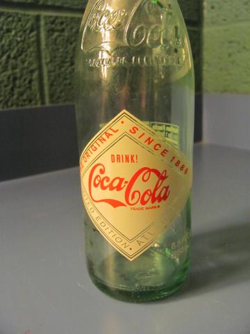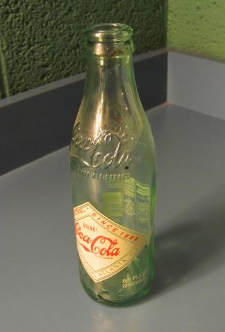 Bar Code 02-01-02-0004 Glass coke bottle with colored label Location Room 221 E - cabinet 21 Dimensions 7 1/2" high Item Keywords bottle hand prop