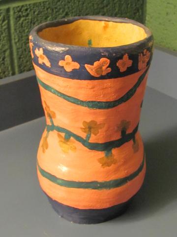 Bar Code 02-02-07-0003 Ceramic painted vase with blue, pink, and green vines and yellow flowers. Location Room 221 E - cabinet 21 Dimensions 8" x 4 1/2" Item Keywords vase set prop