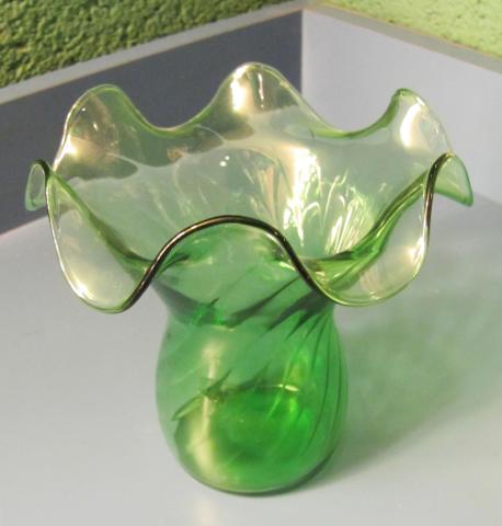Bar Code 02-02-07-0016 green glass vase Location Room 221 E - cabinet 22 Dimensions 5 1/2" high Item Keywords vase set prop