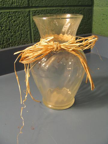 Bar Code 02-02-07-0011 Clear glass vase with straw bow Location Room 221 E - cabinet 22 Dimensions 7" high with 3 1/2" diameter Item Keywords vase set prop