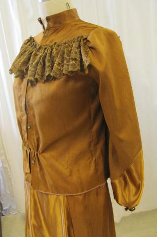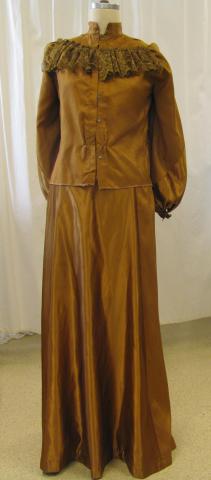 Dress set with golden skirt and top. Long sleeves with lace along clavicles and a high collar.