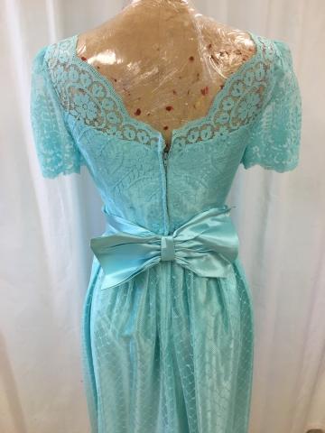 Light teal satin dress with lace overlay. Matching belt.