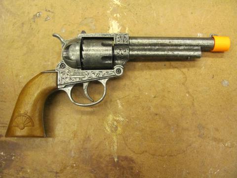 Bar Code 02-01-01-0004 Starter pistol, hand gun, metal with wooden handle, Made in Italy by Edison Giocattoli Location Weapons Cabinet - Scene Shop Dimensions 10" x 4 1/2" Item Keywords gun starter pistol hand gun weapon weaponry