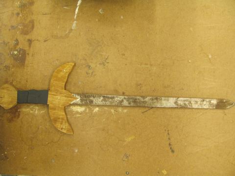 Bar Code 02-01-01-0006 sword, sword, wooden handle with thick, dull metal blade Location Weapons Cabinet - Scene Shop Dimensions 23 1/2" x 7" Item Keywords sword weapon weaponry