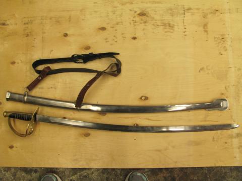 The sword has as imply metal sheath with an attached leather belt. The sword handle is gold colored with a large hilt/hand guard. The inner part of the handle is black leather with small gold metal decoration.