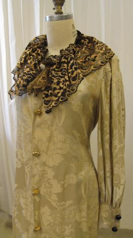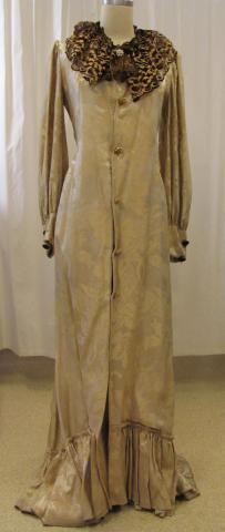 Gold tea gown with long sleeves. There is black and bronze lace around the collar and gold buttons along the front of the gown. 1890s.
