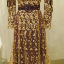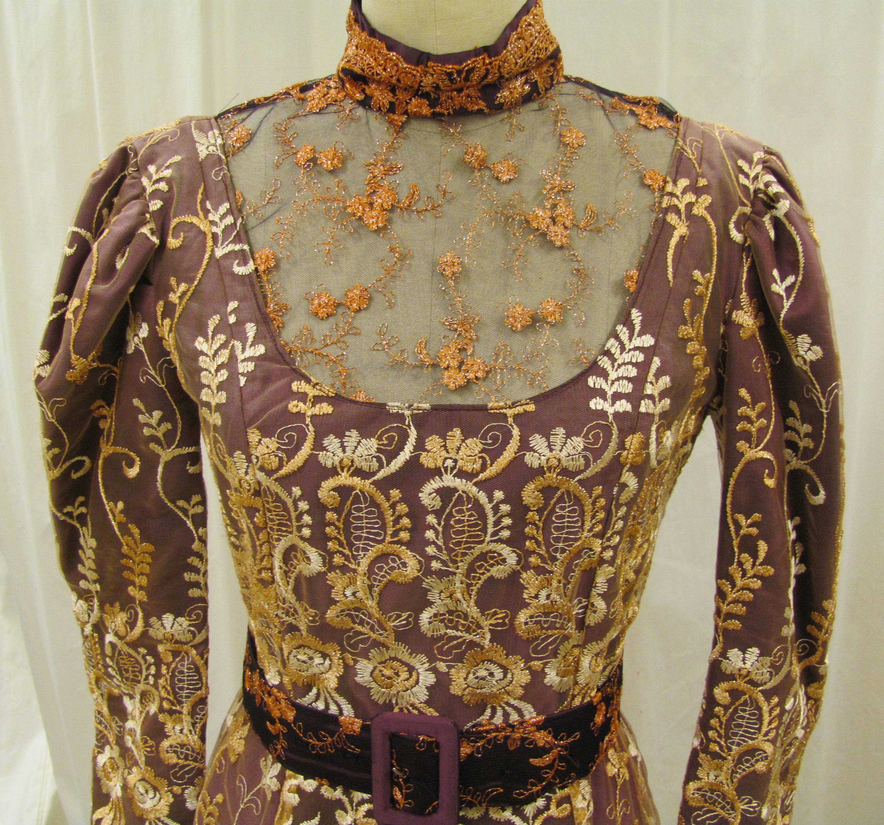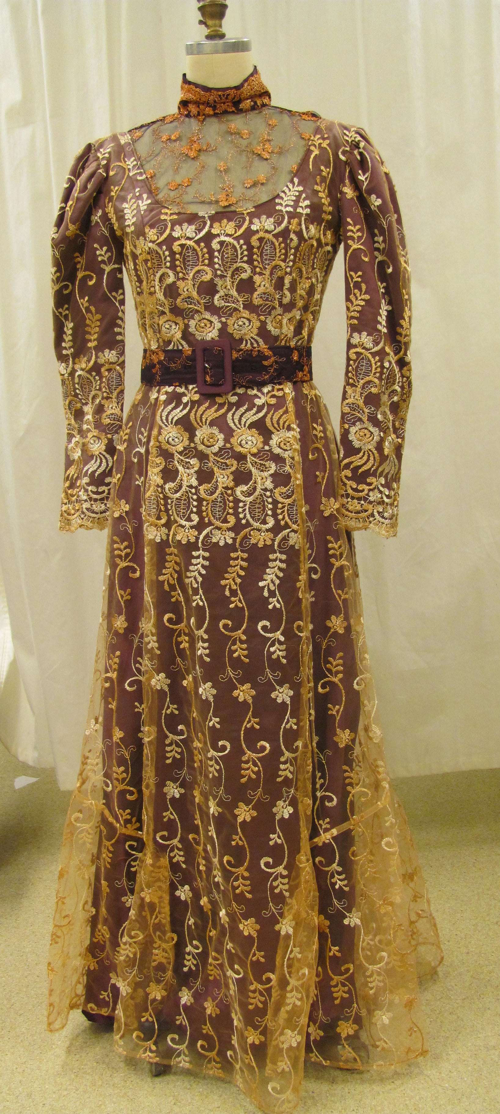 Dress with belt 01-02-03-0004 Purple dress with cream lace overlay. Long sleeves. High color. Darker purple belt. 20th century women's clothing dress