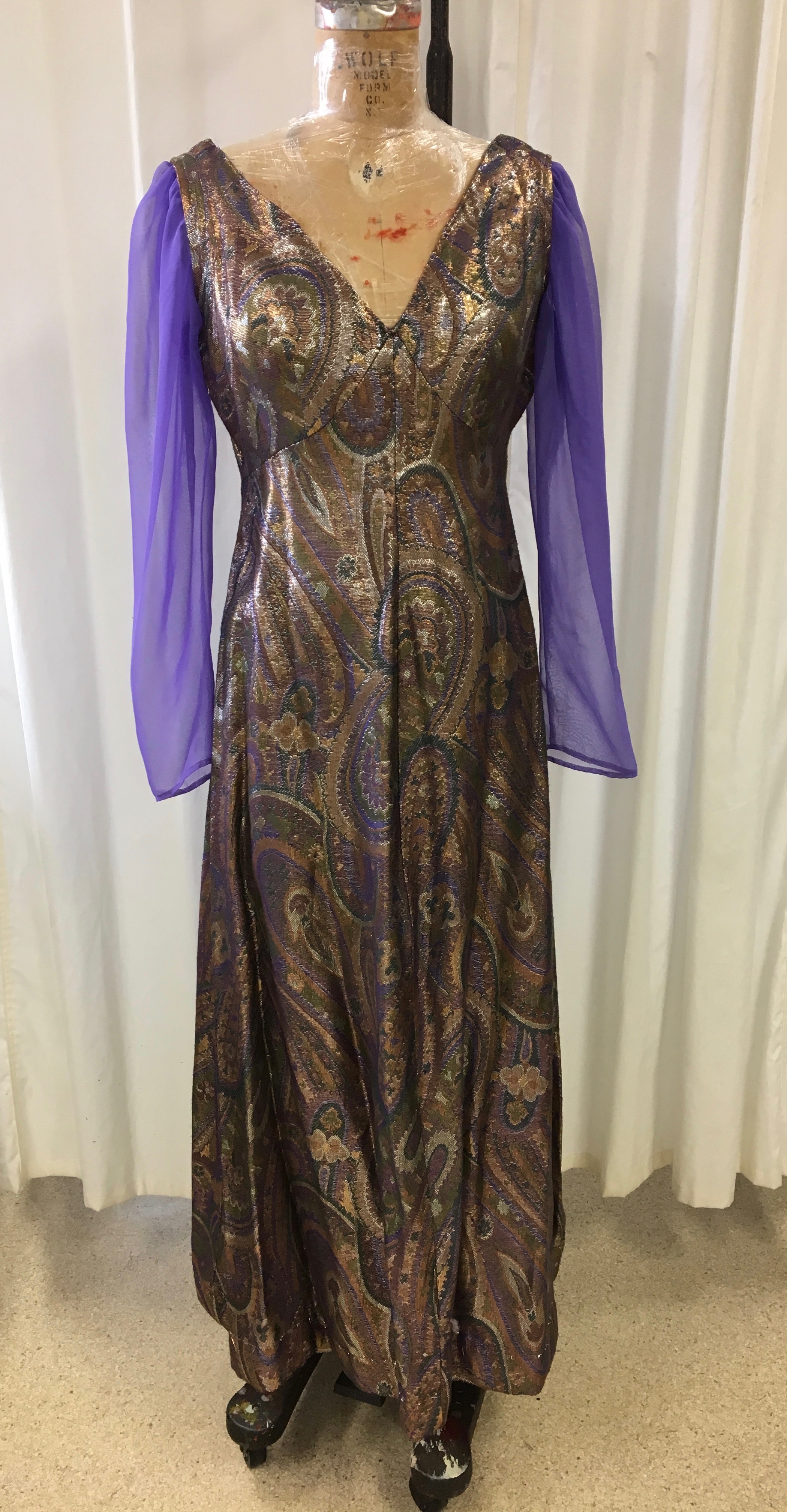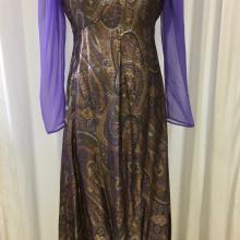 Shiny Paisley Dress 01-02-03-0060 Purple and gold metallic, paisley dress with sheer purple dress. gold Paisley purple dress women's clothing