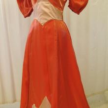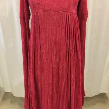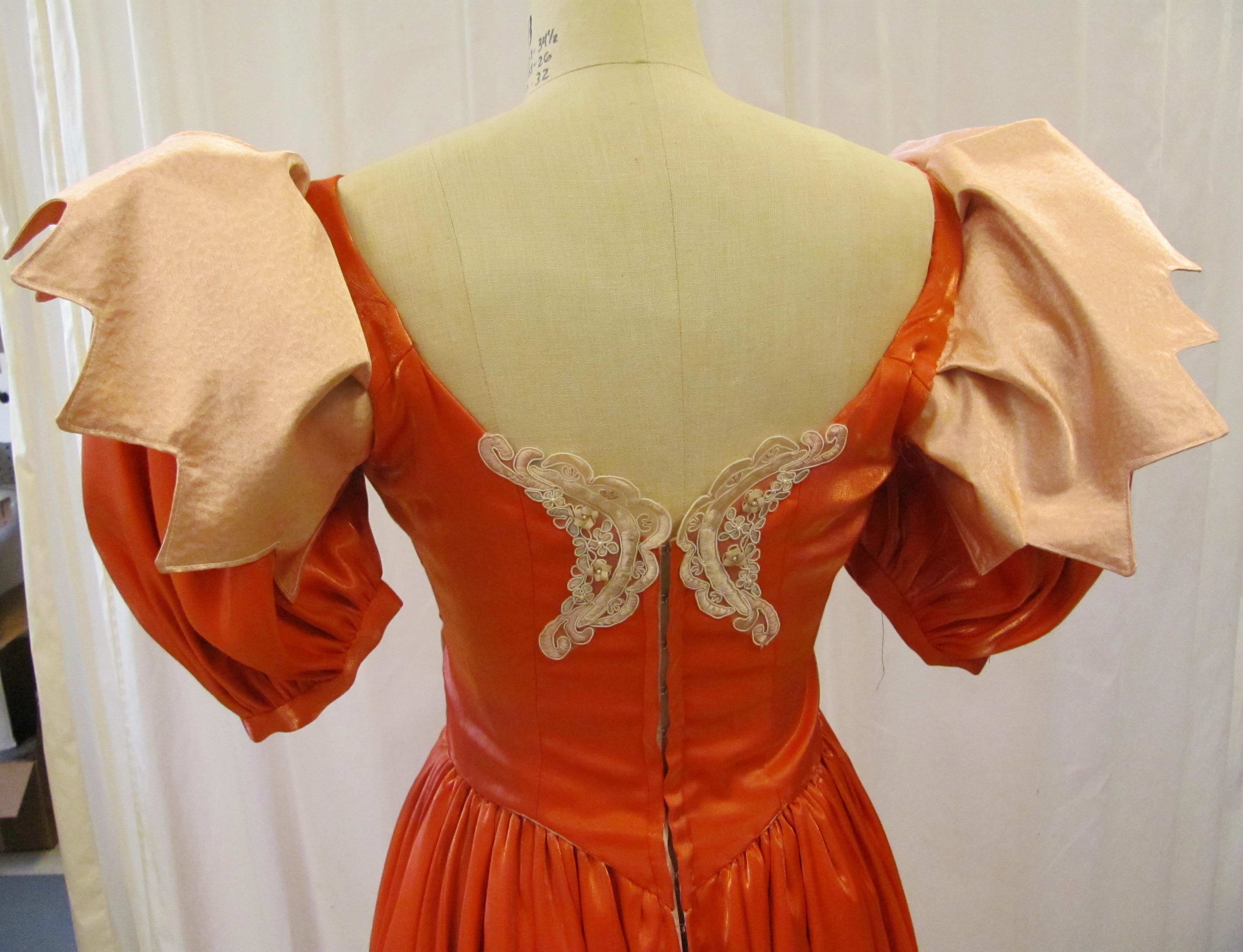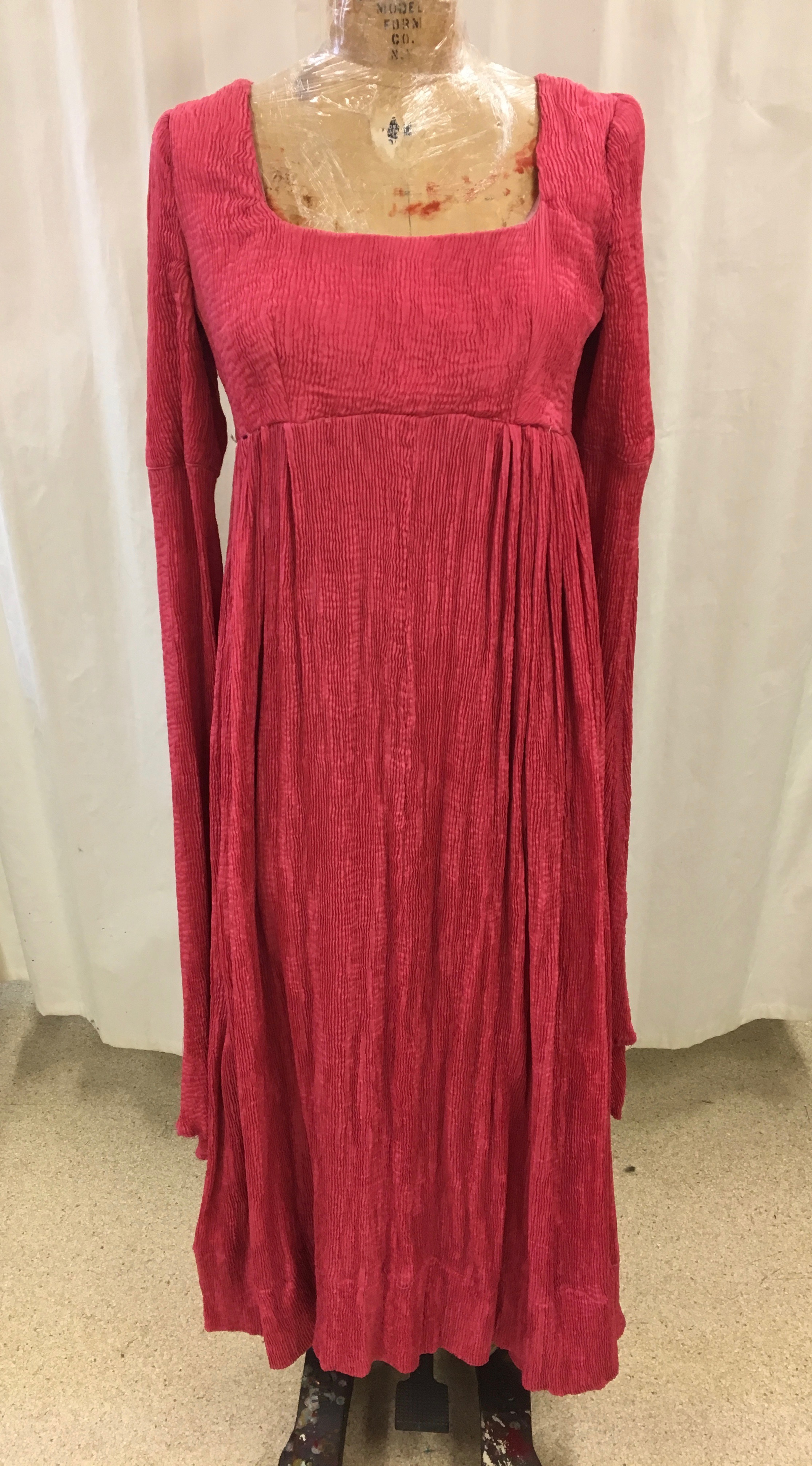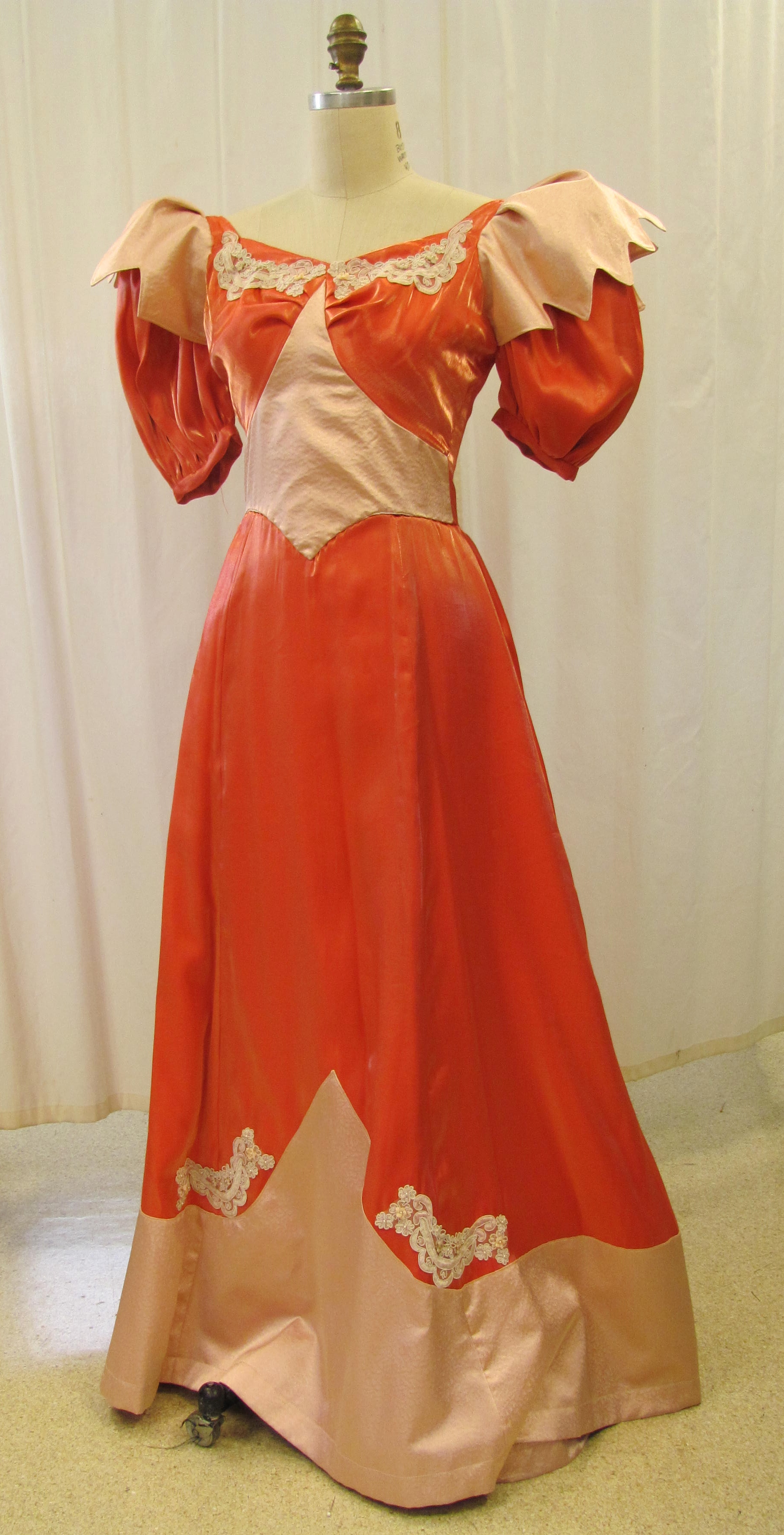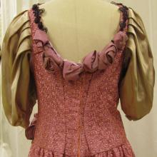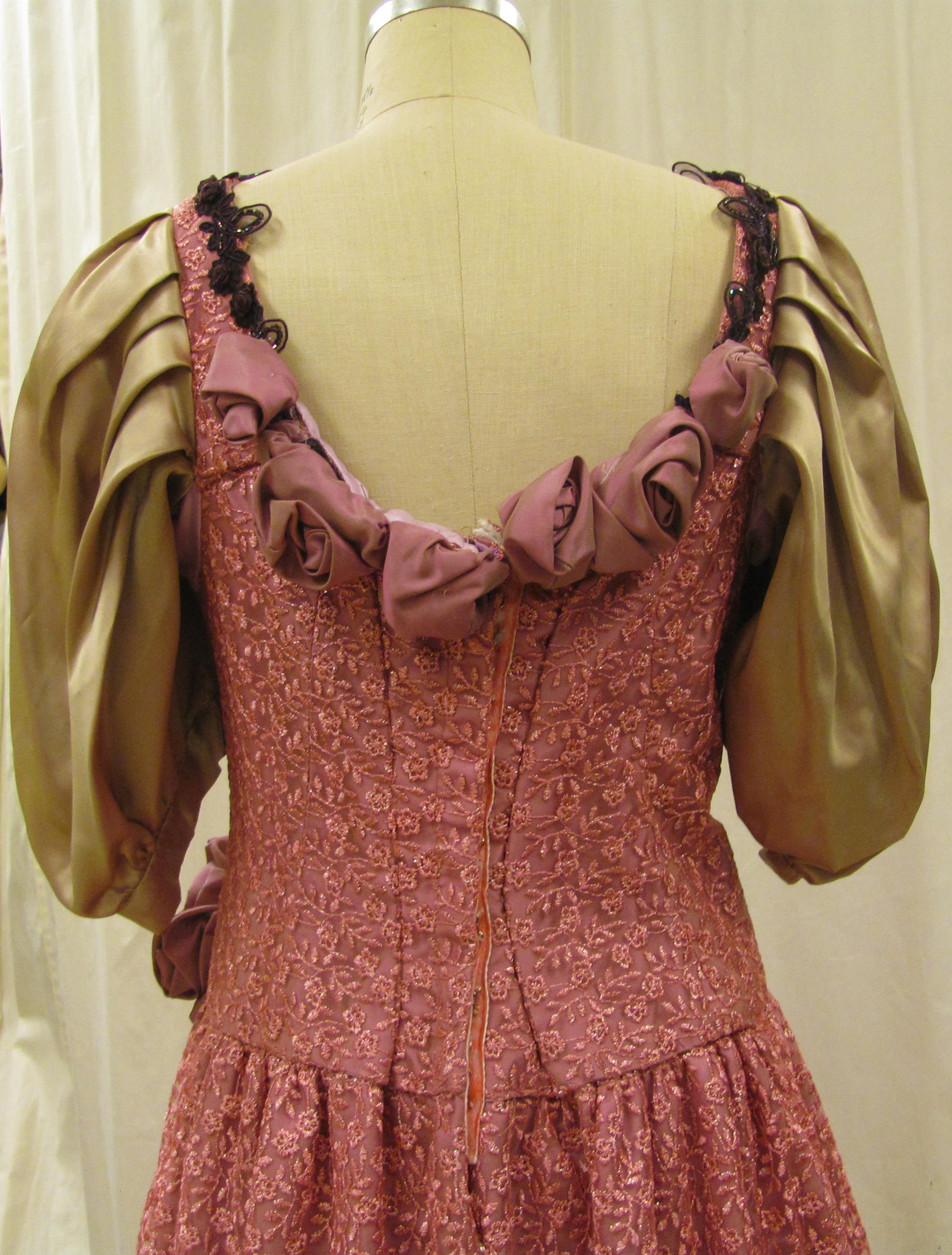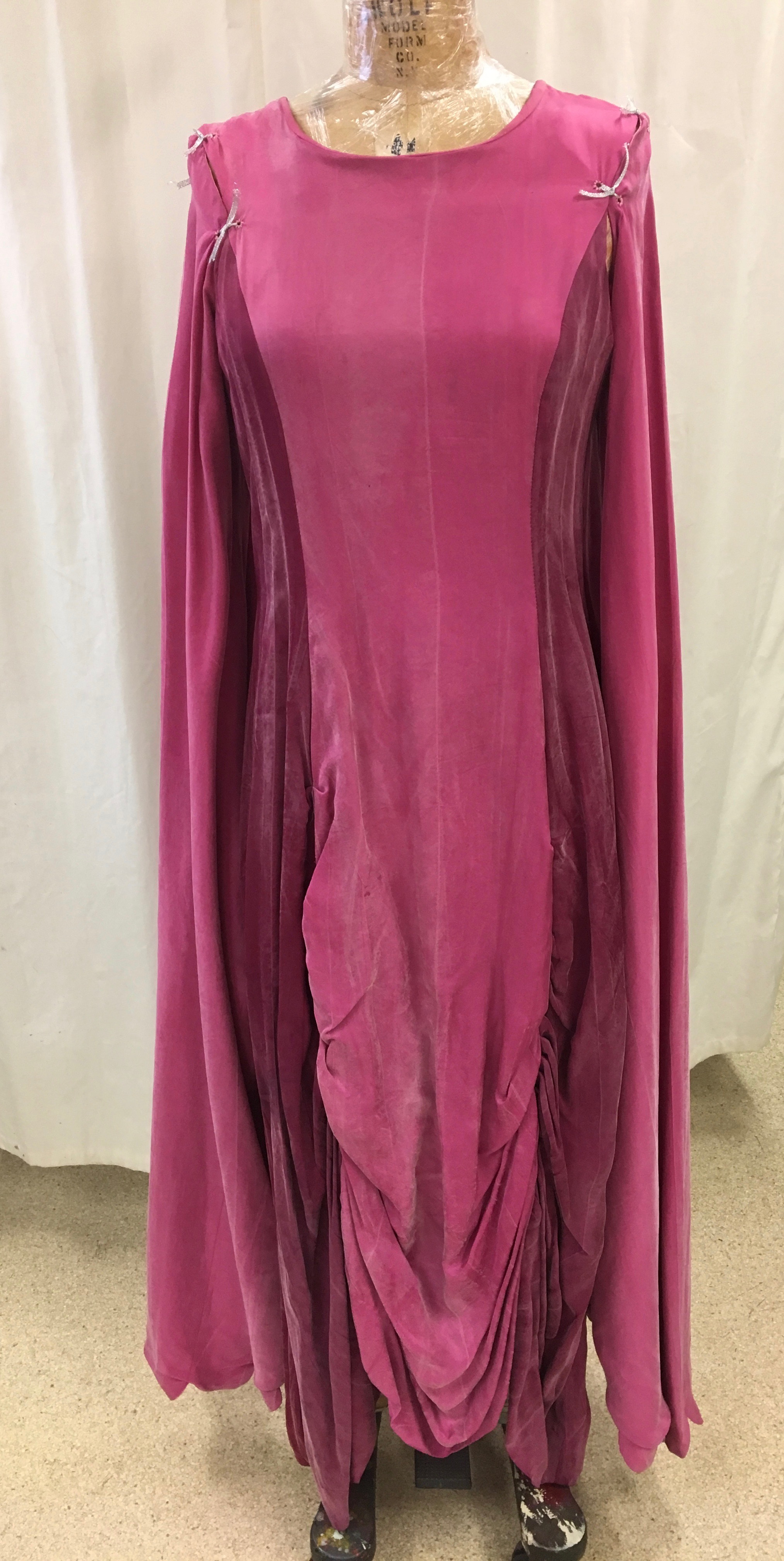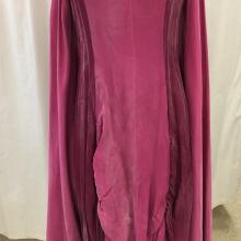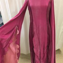 Two tone pink and wine gown with ruching on bottom. Extra long sleeves with scalloped edges. Sleeves attached to bodice with silver ribbons. laced up the back.