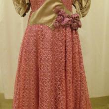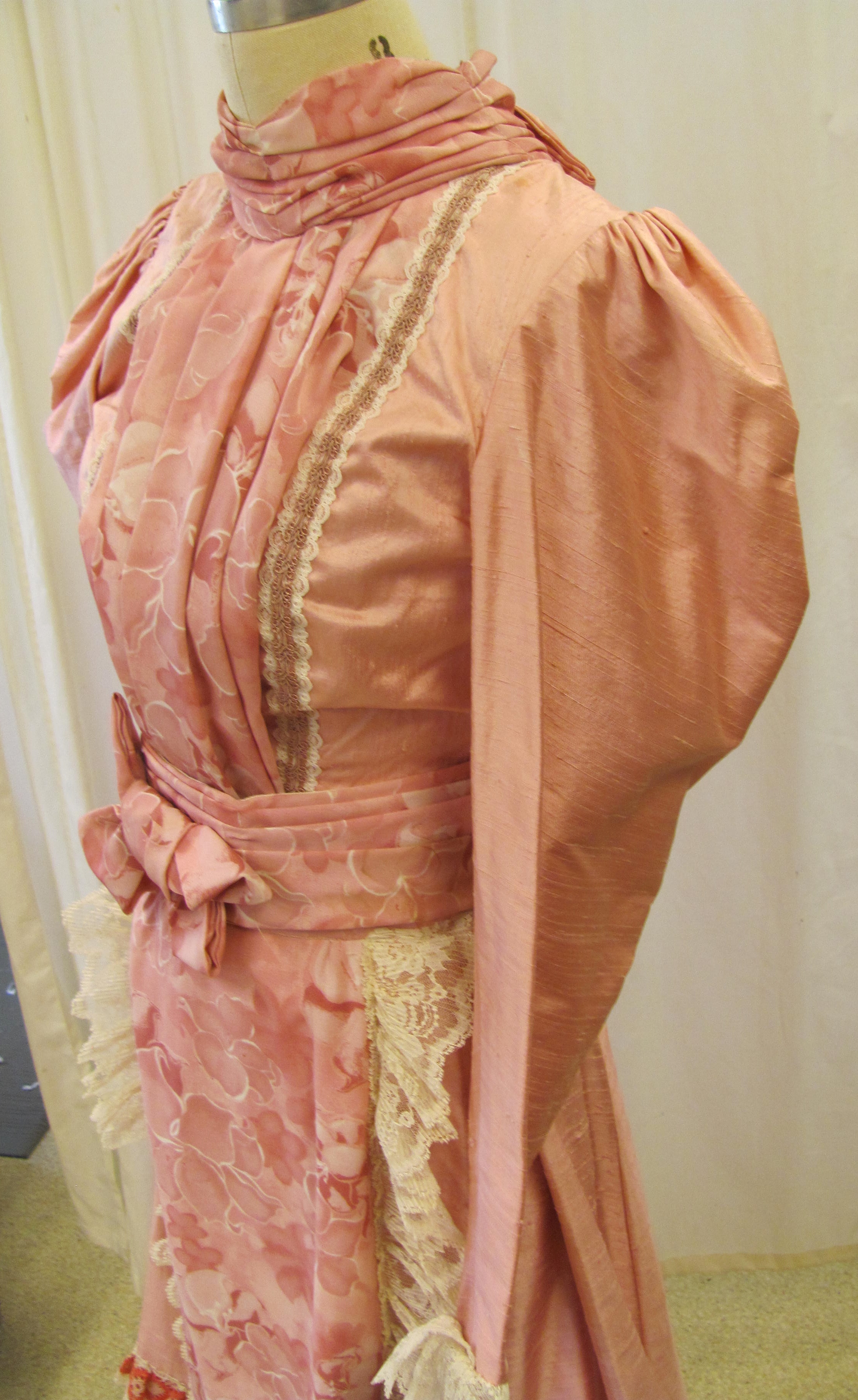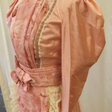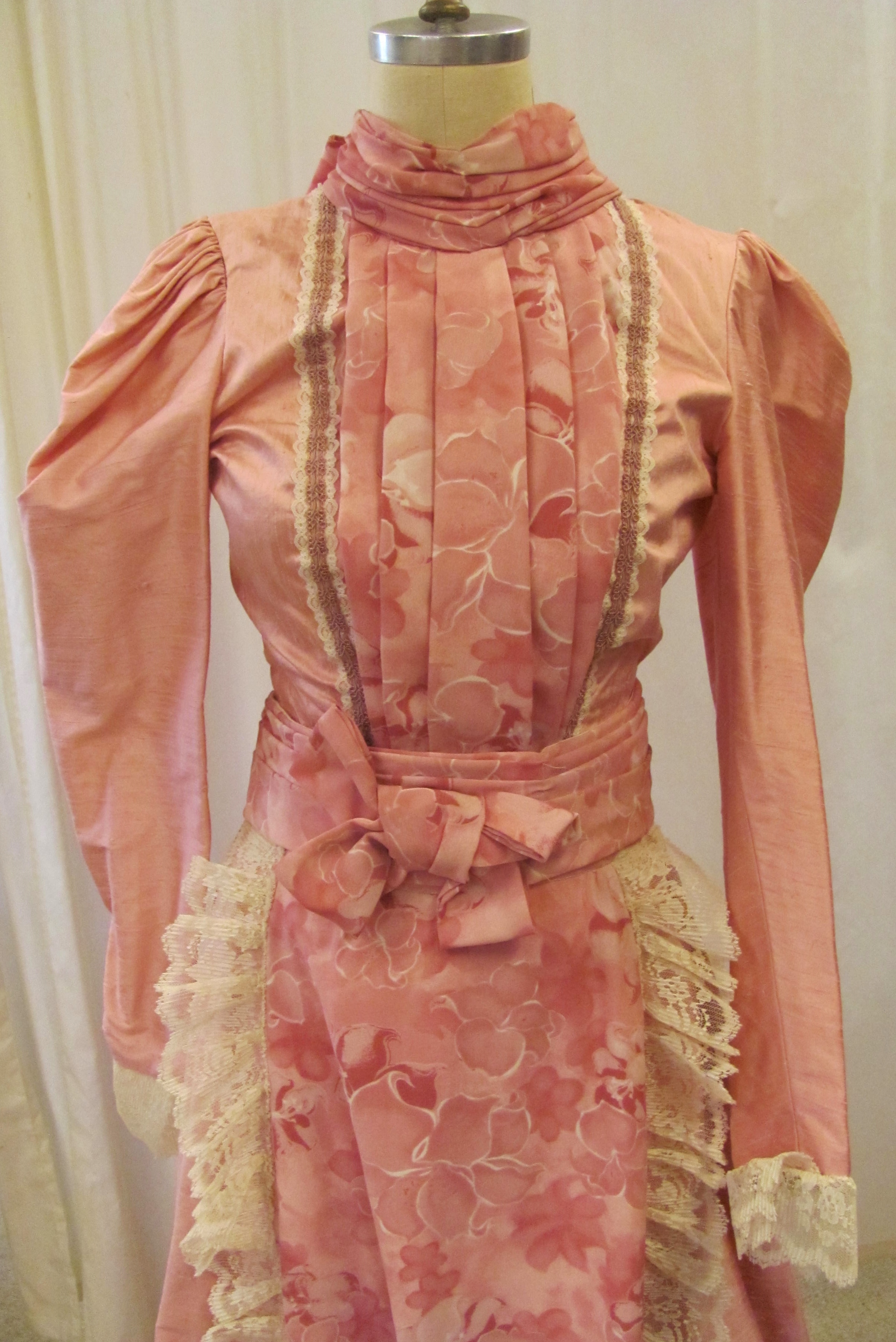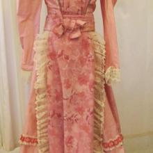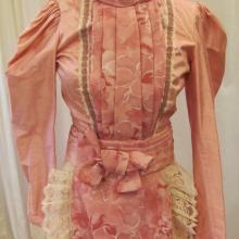 Pink dress set with bodice, skirt and belt. Long sleeves with cream colored lace trim. The dress has two pink materials and cream lace. There is a bow on the belt. High collar.