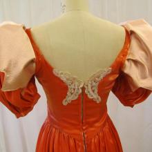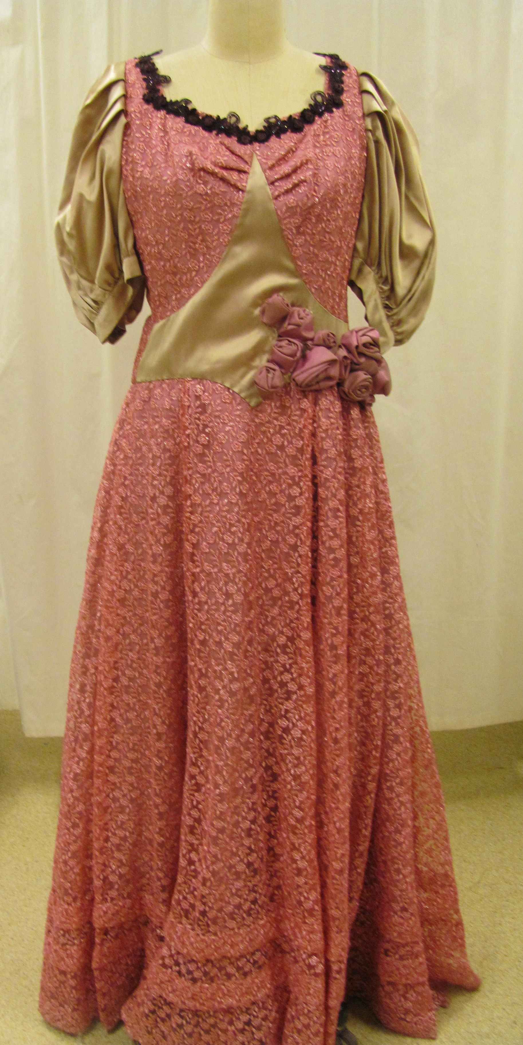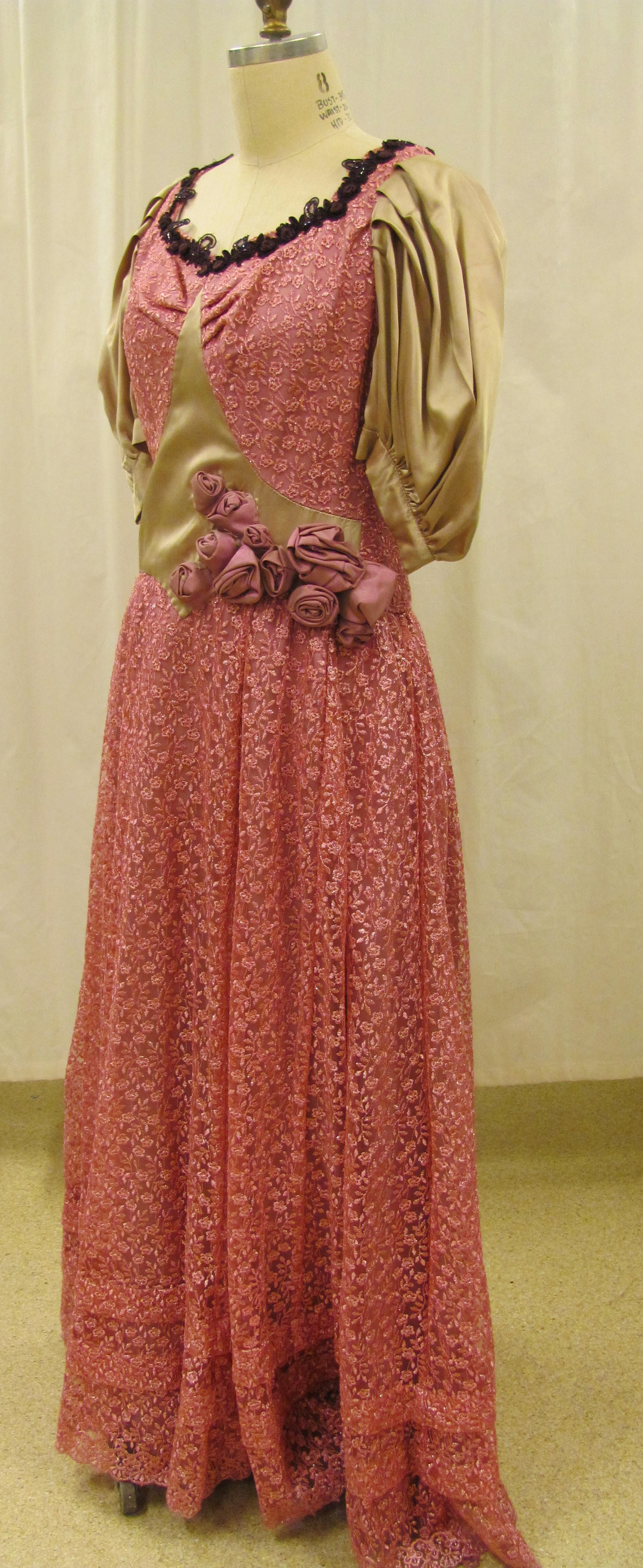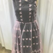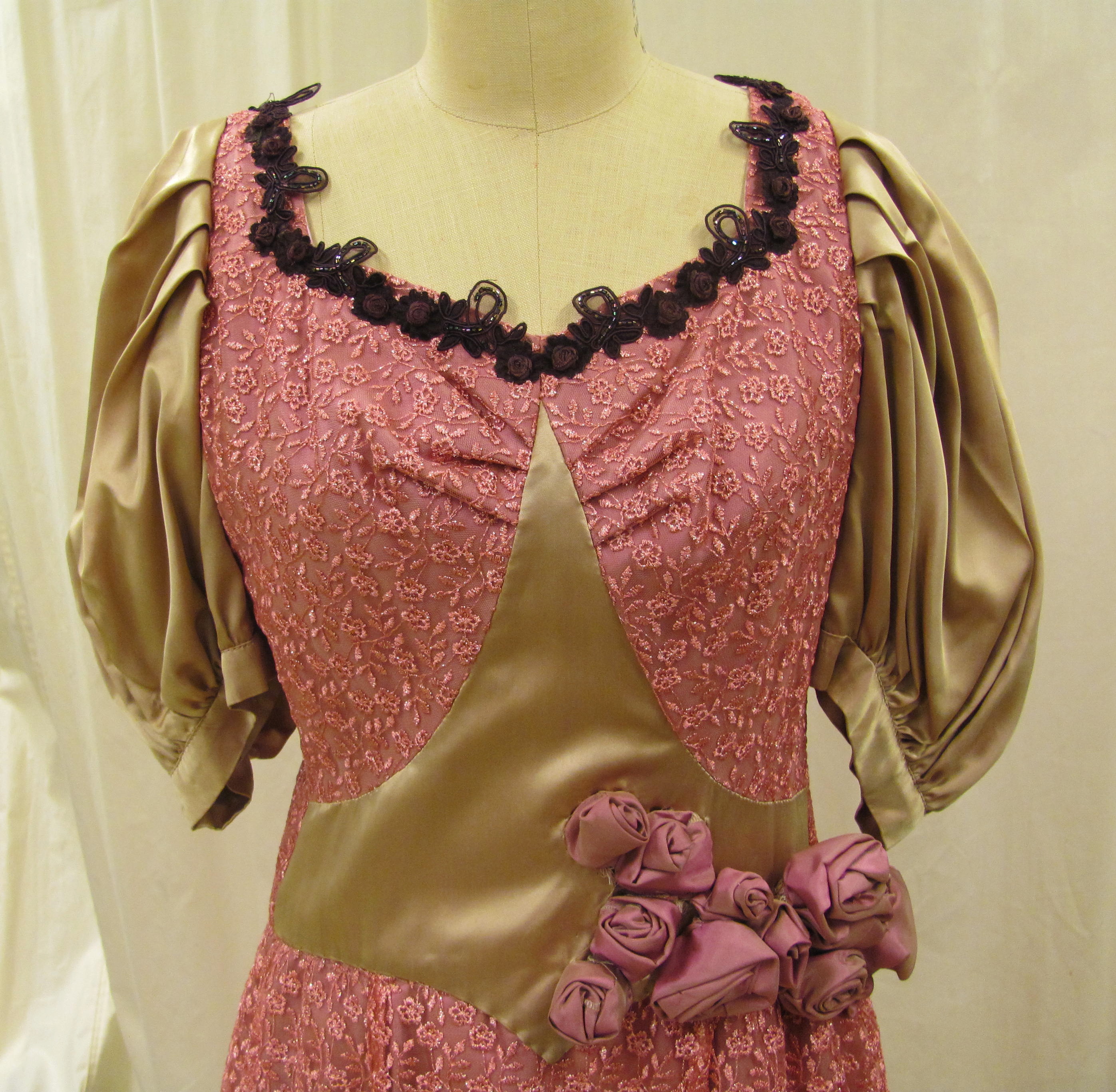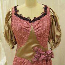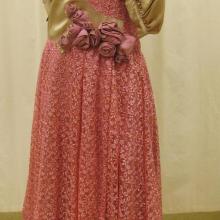 Pink dress with flower applique along the back and on the right side front by the waist. Dark purple beaded trim around the collar and 3/4 length sleeves.