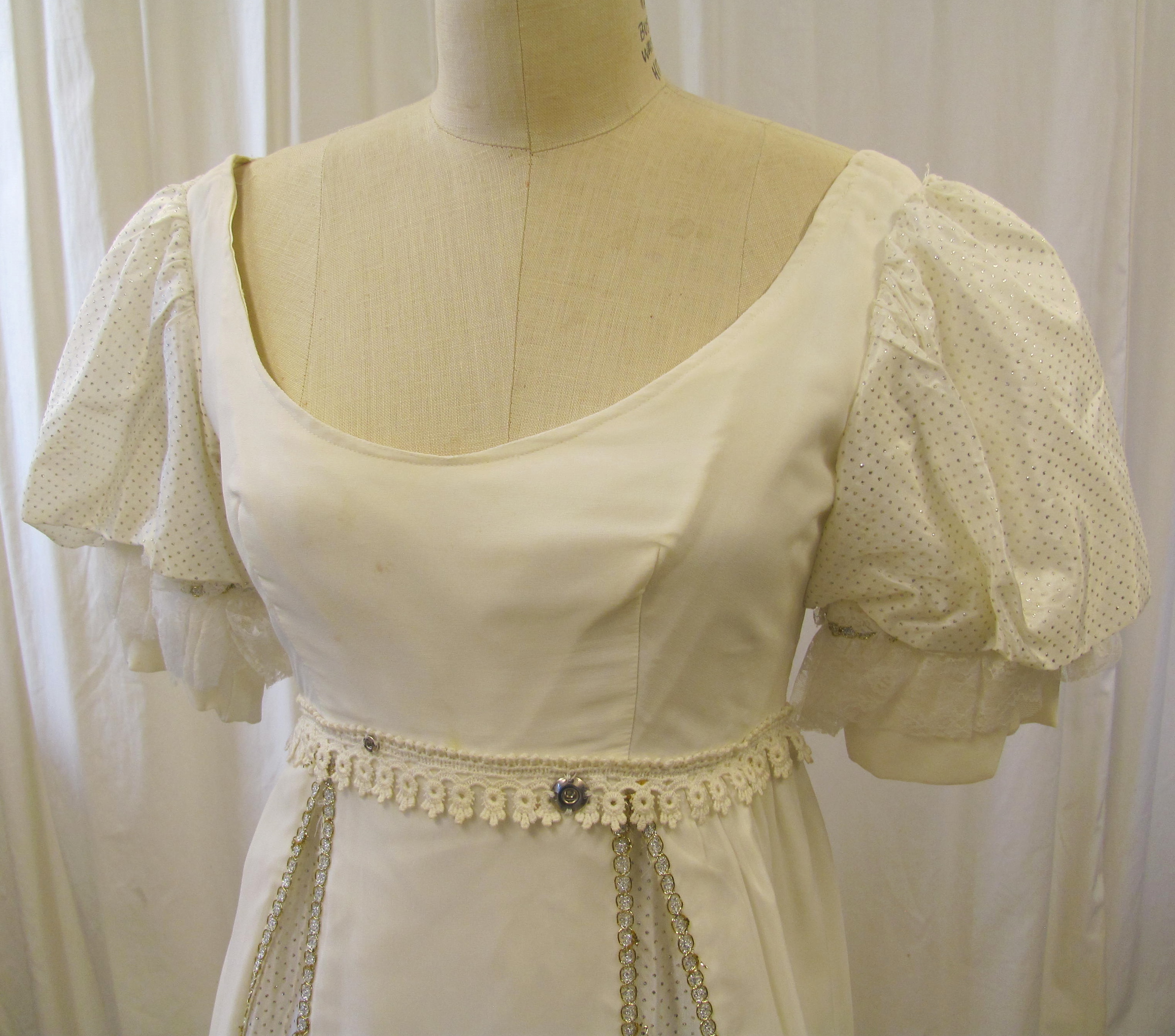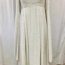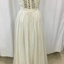 80's Wedding Dress 01-02-12-0006 White wedding dress with beaded and lace bodice. Puff sleeves. Picture shows bustled skirt but can have a train. Wedding dress white 1980's women's clothing