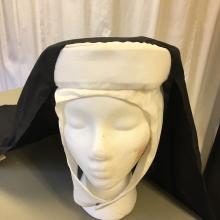 Nun's habit includes: coif, wimple, veil, long black tunic, white scapular and white collar.