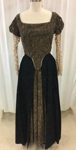 Black floral pattern corduroy skirt with neutral peacock patterned underskirt and bodice with puffed sleeves and gold trim. Damaged lace sleeves.