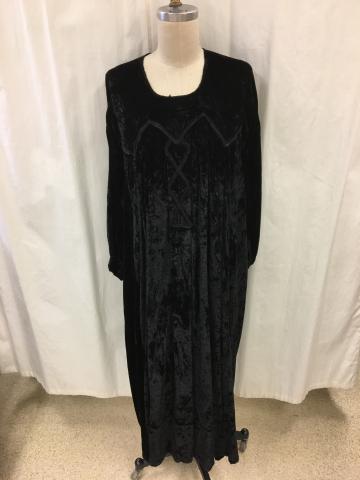 Bar Code 01-02-03-0021 Black crussed velvet dress with long sleeves. Only for small headed people closures. Location Costume Shop Storage Row 7 Left Dimensions 40 Chest Item Keywords black dress women's clothing velvet