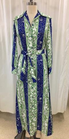 Blue, green and white leaf pattern on vertical stripes. Maxi Dress with buttons up the front and long sleeves. Matching belt.