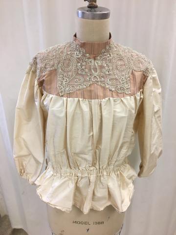 Cream blouse with pink striped yolk with beaded appliques. Gathered at the waist. Gathered 3/4 length sleeves.