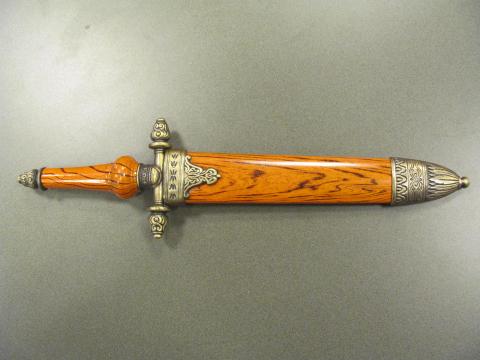 Bar Code 02-01-01-0010 Dagger with a metal and wood handle and sheath. The blade is stainless steel with the image of a colonial man's head in profile at the base of the blade on both sides. Location Jason's office Dimensions 14" x 4" Item Keywords dagger knife weapon weaponry