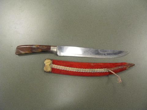 Bar Code 02-01-01-0012 Dagger with brown plastic handle and wood, metal, and fabric sheath. "Crown Shefield stainless " on blade. There is a small engraved lion and crown on the handle. The fabric on the sheath is red, with some green, orange, and grey threading. Location Jason's office Dimensions 14 1/2" x 1 1/2" Item Keywords dagger knife weapon weaponry