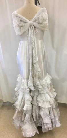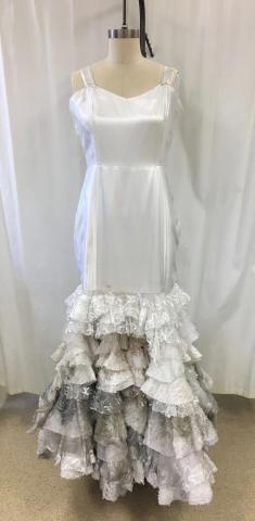 White mermaid style wedding dress. Distressed, dirty, torn. Big bow on back.
