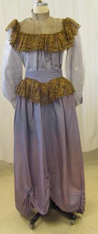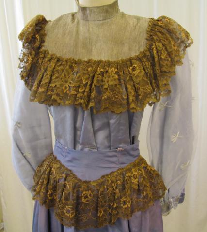 Purple dress set. Top has long sleeves and tan collar and brown lace trim. The sleeves have a lace overlay with a flower design. The skirt is purple with brown lace around the waist. The top buttons in the back and has a high collar.