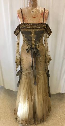 Bar Code 01-02-03-0048 Gold embroidered tulle gown with large strap corsets on front and hips. Off the shoulder sheer sleeves. Location Costume Shop Storage Row 6 Left Dimensions 35 Chest 28 Waist Item Keywords gold Gown women's clothing