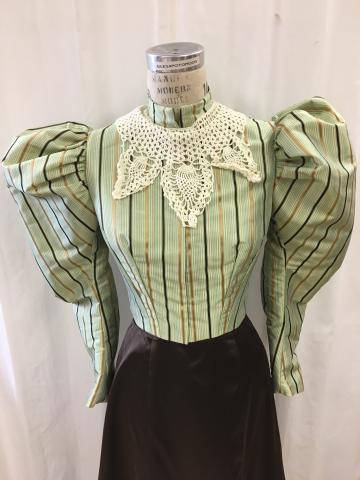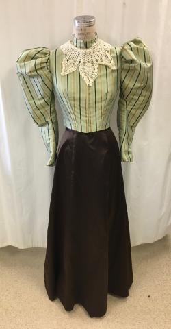 Green, brown, and gold stripped bodice with long puffed sleeves. Made to be paired with brown satin skirt 01-02-02-0001.