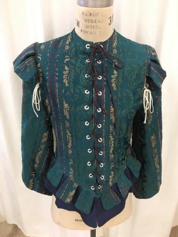 Green, gold and red brocade, renaissance, Doublet. Lace up front and sleeves laced on. Same as 01-01-01-0002 but with no attached shirt.