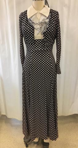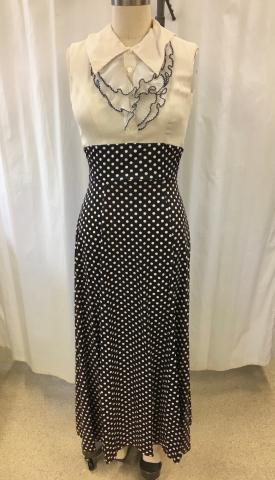 Navy blue with white polka-dot dress with white blouse top. Ruffles on the blouse. Matching bolero jacket.