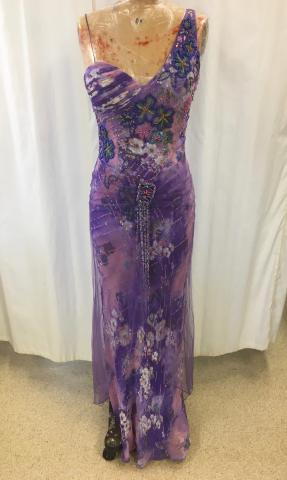 Bar Code 01-02-03-0045 Purple, floral, one shoulder dress. Lots of beading. Location Costume Shop Storage Row 6 Left Dimensions 35 Chest 28 Waist Item Keywords purple Gown Beading dress women's clothing