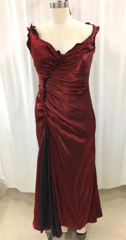 Bar Code 01-02-03-0029 Red ruched sleeveless gown. Location Costume Shop Storage Row 6 Left Dimensions 38 Chest 29 Waist Item Keywords red Gown women's clothing